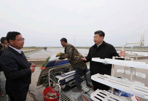 習近平來到黑龍江省撫遠市玖成水稻種植專業(yè)合作社,了解合作社土地流轉(zhuǎn)和采用先進種植技術提高水稻產(chǎn)量效益等情況。(圖片來源:新華視點)