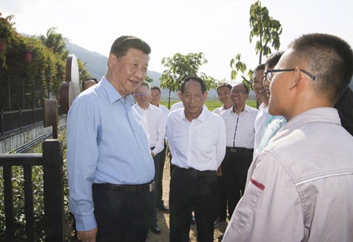 2015年7月16日下午,習近平來到了光東村。進村前,經(jīng)過一大片水稻田時,總書記下車,沿著泥濘的田埂走進田里,同正在田間勞作的村民和農(nóng)技人員攀談起來。