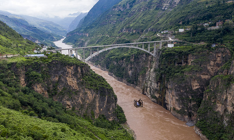 游客們?cè)隗w驗(yàn)云南省巧家縣茂租鎮(zhèn)鸚哥村村民蔣世學(xué)操作的溜索過(guò)江(2020年8月14日攝,無(wú)人機(jī)照片)。新華社記者 江文耀 攝