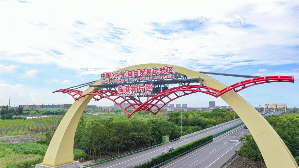 位于上海浦東新區(qū)S2滬蘆高速公路上的中國(guó)(上海)自由貿(mào)易試驗(yàn)區(qū)標(biāo)志門(mén)。(無(wú)人機(jī)照片,新華社記者方喆攝)