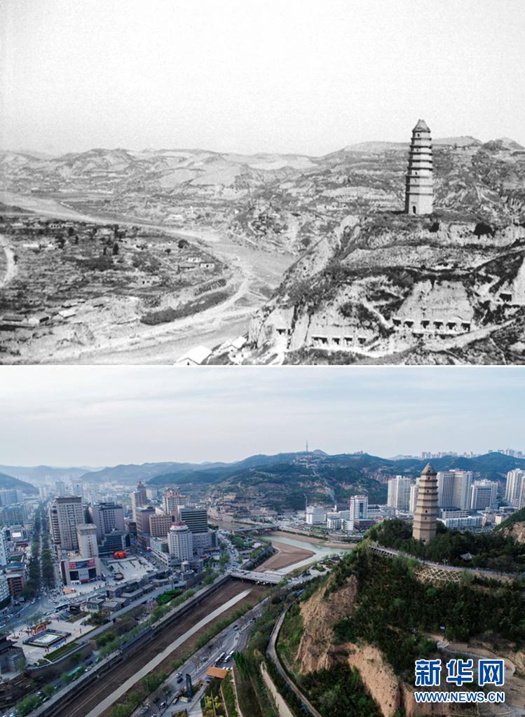 這是一張拼版照片,上圖為:1938年拍攝的延安(資料照片,新華社發(fā));下圖為:2021年4月22日拍攝的延安市(無人機照片,新華社記者張博文攝 )新華社發(fā)