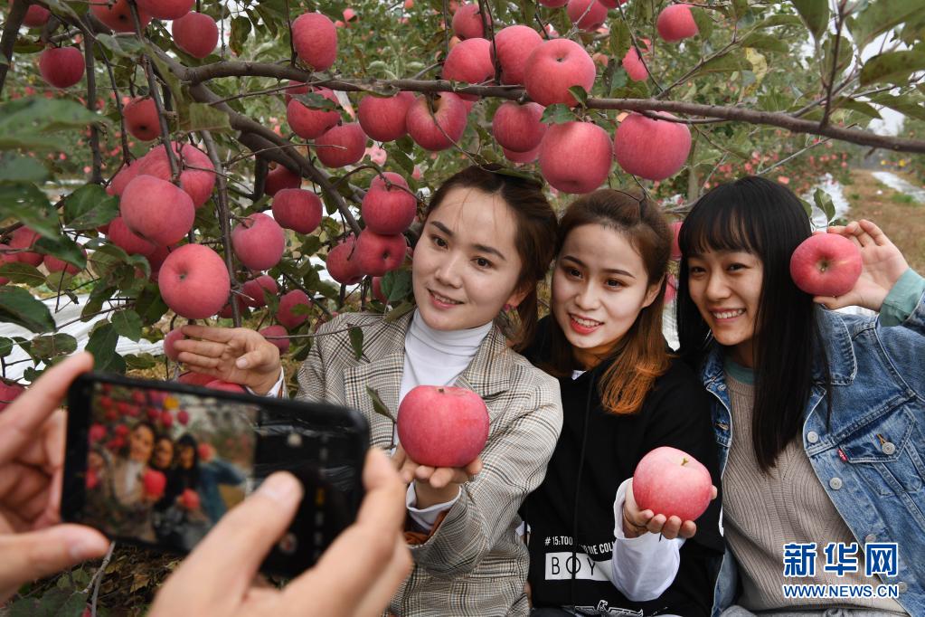 2019年10月22日,游客在陜西省延安市志丹縣雙河鎮(zhèn)李家灣村果園拍照留影。新華社記者 陶明 攝