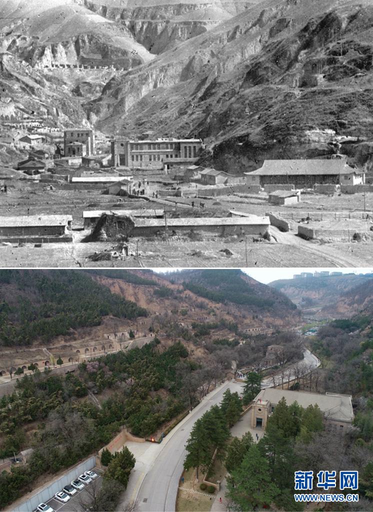 這是一張拼版照片,上圖為:1943年拍攝的延安楊家?guī)X——抗日戰(zhàn)爭時期黨中央所在地(吳印咸攝);下圖為:2021年4月21日拍攝的延安楊家?guī)X革命舊址(無人機照片,新華社記者張博文攝)。新華社發(fā)