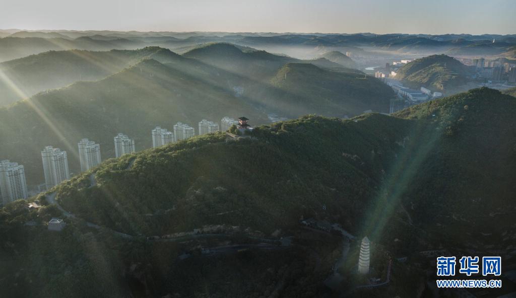 這是2019年8月29日拍攝的被綠色環(huán)繞的陜西省延安市寶塔山(無人機照片)。新華社記者 陶明 攝