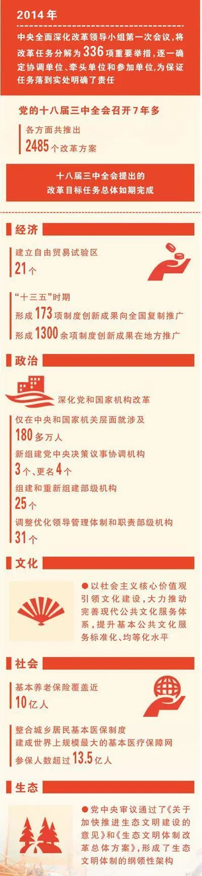 黨的十八屆三中全會—— 堅定不移高舉改革開放大旗(輝煌歷程) 2013年11月9日至12日,黨的十八屆三中全會在北京舉行。 全會聽取和討論了習近平總書記受中央政治局委托作的工作報告,審議通過了《中共中央關于全面深化改革若干重大問題的決定》。習近平總書記就《決定(討論稿)》向全會作了說明。 這是一份具有里程碑意義的宣言書,對中國走什么路、向何處去這個帶有方向性、戰(zhàn)略性的重大問題作出了旗幟鮮明的回答:高舉改革開放旗幟、努力開拓中國特色社會主義事業(yè)更加廣闊的前景。 這是一份具有劃時代意義的藍圖,對在新的歷史起點上全面深化改革作出戰(zhàn)略部署,在理論上有一系列重大創(chuàng)新,在實踐上有一系列重大突破,為實現(xiàn)中華民族偉大復興的中國夢,勾勒出改革路線圖和時間表。 新世紀新階段,改革開放航船,沿著黨的十一屆三中全會以來開辟的正確航道,又一次揚帆起航。 宏偉壯麗的改革事業(yè)到了關鍵時刻 看似尋常最奇崛,成如容易卻艱辛。 時間回溯到2013年金秋。 此時的中國,再次來到了事關前途命運的歷史關口。經(jīng)濟長期高速增長過程中積累的一系列深層次矛盾不斷積聚,舊的問題解決了,新的問題又產生,必須在更多領域、更深層次全面深化改革。 ——全面建成小康社會、加快推進社會主義現(xiàn)代化的宏偉藍圖,要求全面深化改革; ——堅持和發(fā)展中國特色社會主義,要求全面深化改革; ——解決中國發(fā)展面臨的一系列突出矛盾和挑戰(zhàn),實現(xiàn)經(jīng)濟社會持續(xù)健康發(fā)展,要求全面深化改革; ——順應時代潮流,滿足人民期待,保持黨和國家生機活力,要求全面深化改革…… 時代課題,擺在新一屆黨中央領導集體面前。 廣東、河北、甘肅、海南、天津、四川、湖北、遼寧、湖南……黨的十八大以來,習近平總書記調研的足跡遍及大江南北,遍及社區(qū)、鄉(xiāng)村、企業(yè)、學校??倳浺陨铄涞亩床炝透呶萁驳膽?zhàn)略眼光,提出了全面深化改革需要調查研究的6個重大問題—— 進一步形成全國統(tǒng)一的市場體系,形成公平競爭的發(fā)展環(huán)境;進一步增強經(jīng)濟發(fā)展活力,為實現(xiàn)經(jīng)濟持續(xù)健康發(fā)展提供不竭動力;進一步提高宏觀調控水平,提高政府效率和效能;進一步增強社會發(fā)展活力,促進社會和諧穩(wěn)定;進一步實現(xiàn)社會公平正義,通過制度安排更好保障人民群眾各方面權益;進一步提高黨的領導水平和執(zhí)政能力,充分發(fā)揮黨總攬全局、協(xié)調各方的作用。 這6個重要課題,直指中國改革發(fā)展的關鍵。 1978年,黨的十一屆三中全會如平地驚雷,打破堅冰,開啟波瀾壯闊的改革開放航程。 2013年,宏偉壯麗的改革事業(yè)又一次到了關鍵時刻,決定著中華民族復興偉業(yè)的圓夢藍圖徐徐展開。 為謀定未來作出全面系統(tǒng)的戰(zhàn)略部署 2013年11月12日,中國再次吸引了世界關注的目光。 下午3時,黨的十八屆三中全會舉行閉幕會,出席全會的中央委員經(jīng)表決,一致通過了《中共中央關于全面深化改革若干重大問題的決定》。 當習近平總書記宣布《決定》通過時,會場上響起了熱烈的掌聲。 翻開這份決定,從以經(jīng)濟體制改革為主到全面深化經(jīng)濟、政治、文化、社會、生態(tài)文明體制和黨的建設制度改革,是新中國成立以來最為全面系統(tǒng)的改革部署。 “相比過去,新時代改革開放具有許多新的內涵和特點,其中很重要的一點就是制度建設分量更重,改革更多面對的是深層次體制機制問題,對改革頂層設計的要求更高,對改革的系統(tǒng)性、整體性、協(xié)同性要求更強,相應地建章立制、構建體系的任務更重。”習近平總書記鮮明指出新時代改革開放的特點。 十八屆三中全會把國家治理體系和治理能力建設擺到更加突出的位置,通過加強頂層設計、系統(tǒng)配套、整體推進,為謀定未來作出了全面系統(tǒng)的戰(zhàn)略部署。 ——《決定》明確了全面深化改革的總目標,體現(xiàn)了中國共產黨人的政治勇氣:完善和發(fā)展中國特色社會主義制度,推進國家治理體系和治理能力現(xiàn)代化。 ——《決定》指出了全面深化改革的目的,體現(xiàn)了中國共產黨人的必勝信心:進一步解放思想、解放和發(fā)展社會生產力、解放和增強社會活力。 ——《決定》部署了全面深化改革的重點,體現(xiàn)了中國共產黨人的堅強決心:必須以經(jīng)濟體制改革為重點、發(fā)揮經(jīng)濟體制改革牽引作用。 ——《決定》提出了全面深化改革的出發(fā)點和落腳點,體現(xiàn)了中國共產黨人的崇高理念:全面深化改革必須以促進社會公平正義、增進人民福祉為出發(fā)點和落腳點。 由此,中國改革開放跨入全新境界。 各方面軍迅速挺進全面深化改革主戰(zhàn)場 方向決定道路,道路決定命運。 ——黨的十八屆三中全會,彰顯的是中國共產黨人的寬廣眼界。習近平總書記指出,我們必須正確認識國際國內形勢新變化,自覺適應實現(xiàn)全面建成小康社會目標新要求,把握住、利用好發(fā)展機遇,看得到、應對好風險挑戰(zhàn),以更加堅定的信心、更加有效的舉措推進改革開放。 ——黨的十八屆三中全會,彰顯的是中國共產黨人的責任擔當。習近平總書記指出,我們要堅持改革開放正確方向,敢于啃硬骨頭