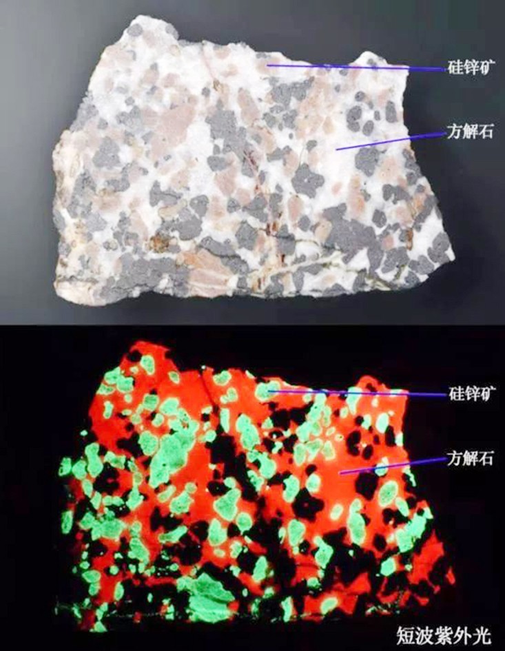 這是一種非常容易識(shí)別的含有熒光礦物的巖石,其中的兩種礦物會(huì)在短波紫外光下發(fā)出強(qiáng)烈的熒光:方解石(Calcite)發(fā)出紅色熒光,硅鋅礦(Willemite)發(fā)出綠色熒光。紅綠對(duì)比強(qiáng)烈,再加上沒(méi)有熒光的黑色鋅鐵礦(NFFranklinite),非常具有觀賞性。通常這種巖石被稱為“圣誕方解石(Christmas Calcite)”或者“瘋狂方解石(CrazyCalcite)”。