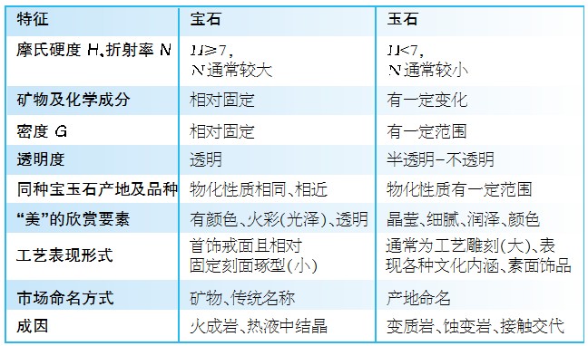 就珠寶的大類來說,可分為寶石與玉石兩大類。寶石是天然礦物單晶體,玉石則指天然礦物的集合體。在礦物成分構(gòu)成、物理化學性質(zhì)、接受的人群、飾品的表現(xiàn)形式上兩者盡管有相似之處,但更有差異。寶石與玉石的異同見下表。這里的玉石主要指接受面較廣、市場占有率較高的翡翠、和田玉,寶石指以鉆石、紅藍寶石、祖母綠、海藍寶石、碧璽、石榴石等為代表的常見寶石。