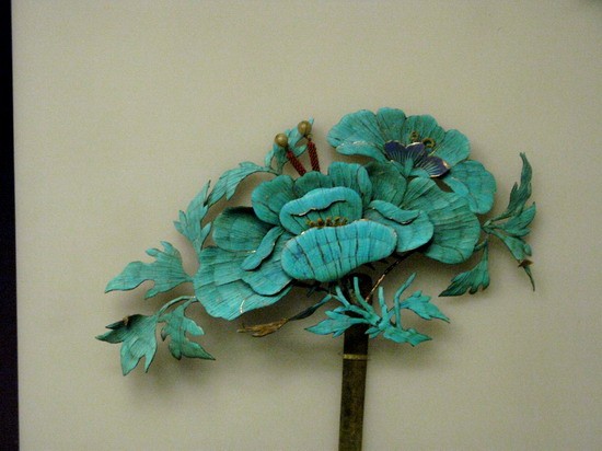 點(diǎn)翠工藝的高峰出現(xiàn)在清朝,由于繼承和發(fā)展了金屬制胎以及點(diǎn)翠羽等更為復(fù)雜的工藝形式,“點(diǎn)翠”逐漸發(fā)展成為一門獨(dú)特的金工技藝,隨即成為金銀制作中的重要工種。因?yàn)樯使馊A艷麗且永不褪色,點(diǎn)翠頭飾也成為宮廷后妃十分流行的飾品?;蕦m后妃們幾乎所有的首飾都用點(diǎn)翠工藝作為裝飾,從鈿子、簪釵、頭花、耳環(huán),甚至到團(tuán)扇、插屏、盆景等其他生活用品,處處翠色,成為風(fēng)尚。
