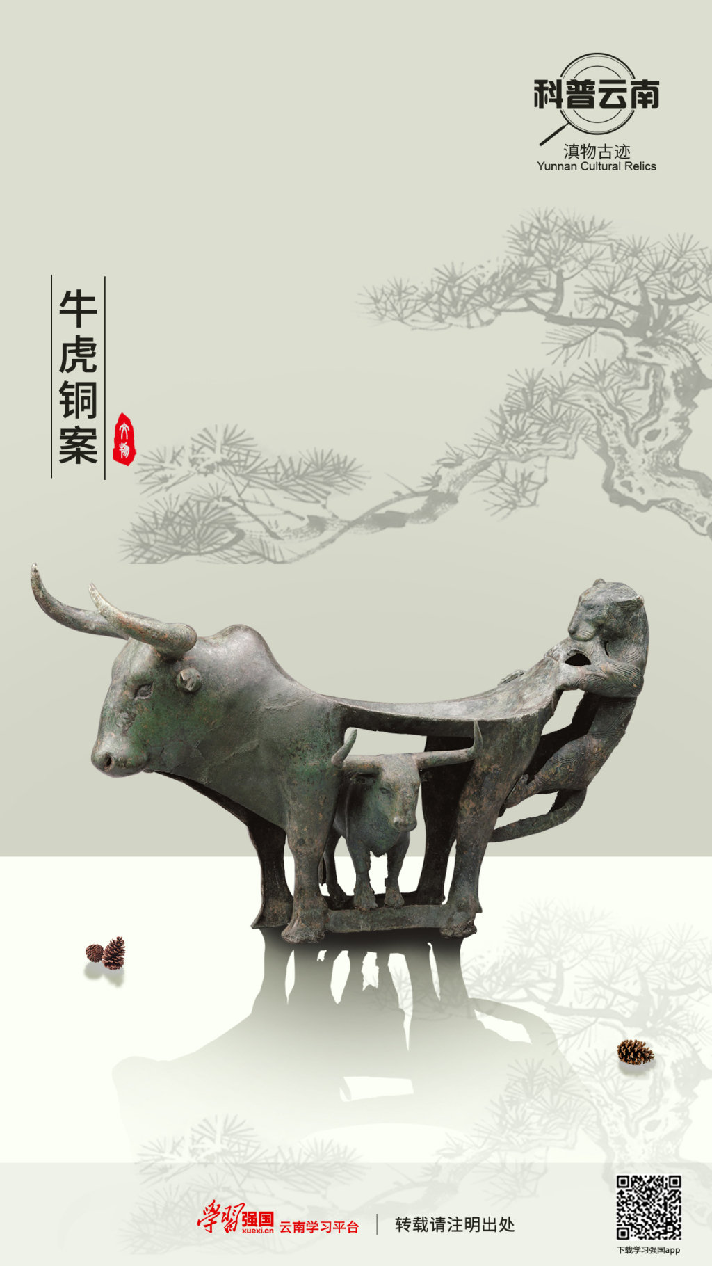 文物描述:此案由一虎二牛組成:主體為一立牛,巨角前伸,肩部隆起,四條腿作案足,牛背下凹呈盤(pán)狀作案面;牛后部攀爬狀一虎,躬身下垂,咬住牛尾,前爪緊扣案沿,后腿蹬于牛腿上;大牛腹下中空,一頭巨角前伸體量較小的牛橫向立于大牛前后腿間橫檔上。器物表現(xiàn)主題為滇國(guó)青銅器常見(jiàn)的“虎噬?!鳖}材,系分體鑄造后再鑄接而成。牛虎銅案造型奇巧,動(dòng)靜結(jié)合,比例協(xié)調(diào),立意豐富,作為云南民族文化的標(biāo)志性器物之一,既有中原地區(qū)四足案的特征,又具有濃郁的地方特點(diǎn)和民族風(fēng)格,堪稱中國(guó)青銅藝術(shù)品之杰作。