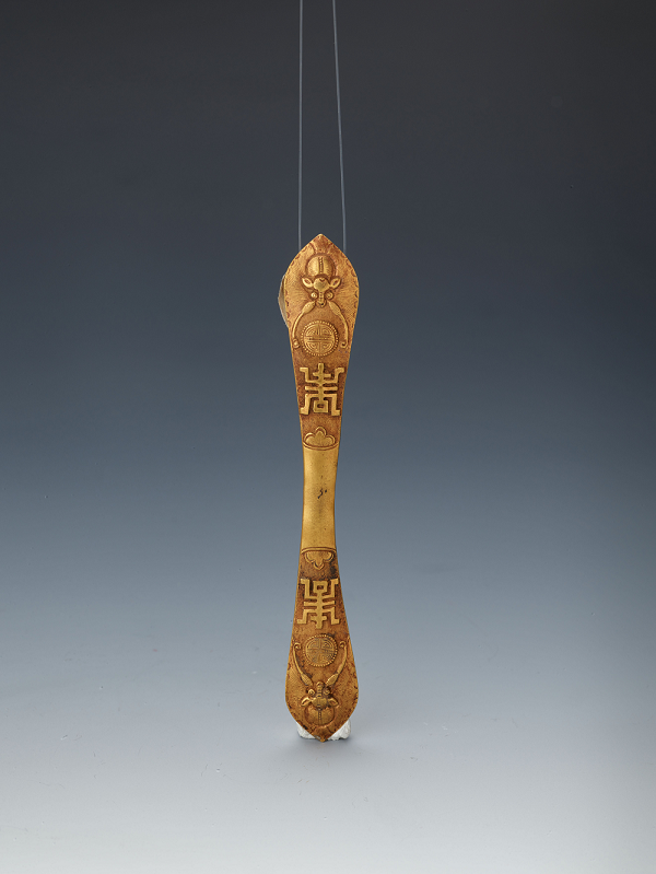 鏨刻福壽紋金發(fā)簪圈,清代,曲阜方家村出土,現(xiàn)藏于孔子博物館。發(fā)簪是古代男女常用的首飾,呈單股長針狀。最初的用途是綰束頭發(fā)。古代制作簪子的材質有金、銀、玉、銅、鐵等,充當著男女情愛的信物和談婚論嫁的聘物。唐·杜甫《春望》詩:“白頭搔更短,渾欲不勝簪?!?/p>