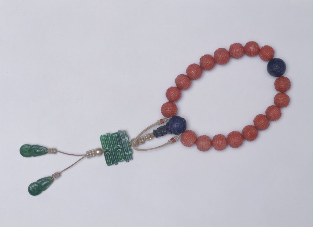 手串以十八顆珊瑚珠串成,以青金石佛頭、結(jié)珠及翡翠墜為飾。手串雕工精細(xì),雕刻四面“囍”字的珊瑚珠與兩面“囍”字的青金石佛頭、結(jié)珠,使本來(lái)不甚鮮亮的珠體倍加耀眼;翠墜角雖小,但也是將雕刻發(fā)揮到了極致,將一只蝙蝠口銜“五銖”錢幣的動(dòng)態(tài)雕琢得栩栩如生,并具有“福在眼前”之吉祥寓意。此為清代后妃首飾。