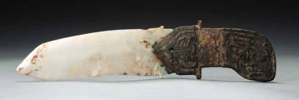 戈為較早出現(xiàn)的青銅兵器,二里頭遺址中就有發(fā)現(xiàn),一直沿用至西漢初期。長32厘米、寬6.5厘米。戈為復(fù)合型武器,一般固定在木柄之上。一套完整的戈應(yīng)包括戈頭、柲、冒、鐏四部分。1974 年河南省新鄭市新村出土。