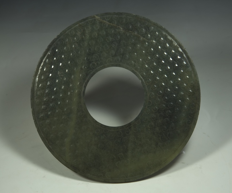 戰(zhàn)國·谷紋玉璧,直徑21.9厘米,厚0.7厘米。器扁平,圓形,晶瑩溫潤,兩面均飾淺浮雕谷紋。