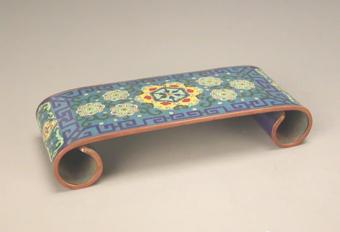 這件遼寧營口市博物館館藏的清代掐絲琺瑯墨床,長21厘米,寬9厘米,高4.3厘米,銅胎,長方條幾形,雙足內(nèi)卷,面嵌左右對稱的掐絲琺瑯勾云團花紋飾。造型柔和流暢,掐絲細(xì)勻,紋飾繁密,打磨光滑,鍍金明亮,藍(lán)釉青翠艷麗,整件作品小巧精制,令人愛不釋手,是一件很典型的清代掐絲琺瑯器物,極具當(dāng)時金光燦爛、豪華富貴的藝術(shù)風(fēng)格。