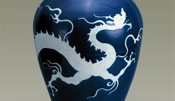 霽藍(lán)釉白龍紋梅瓶是元代瓷器制品的代表作,也是元代藍(lán)釉器中極為引人注目的藝術(shù)珍品。霽藍(lán)釉是化學(xué)元素鈷的呈色,最早見(jiàn)于唐三彩和唐白釉藍(lán)彩上,但這些都屬于低溫藍(lán)釉。元代,景德鎮(zhèn)的瓷工熟練地掌握了呈色劑制作方法,成功地?zé)瞥隽烁邷厮{(lán)釉。收藏于揚(yáng)州博物館的這件霽藍(lán)釉白龍紋梅瓶就是景德鎮(zhèn)窯高溫藍(lán)釉的杰出作品。