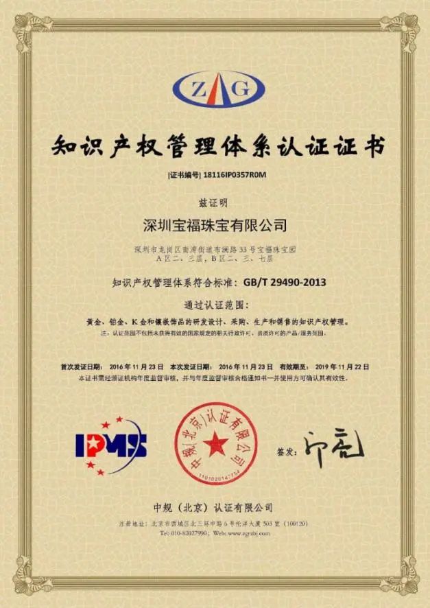 寶福十分注重知識(shí)產(chǎn)權(quán)體系的建設(shè),不斷提升創(chuàng)意設(shè)計(jì)水平,革新生產(chǎn)工藝,每年投入大量資金用于新產(chǎn)品設(shè)計(jì)研發(fā),以及國(guó)際化先進(jìn)設(shè)備和人才引進(jìn),建立起知識(shí)產(chǎn)權(quán)管理體系。截至目前,寶福擁有注冊(cè)自主知識(shí)產(chǎn)權(quán)的24項(xiàng)發(fā)明專利、63項(xiàng)實(shí)用新型專利、160 多項(xiàng)產(chǎn)品外觀設(shè)計(jì)專利和31項(xiàng)著作權(quán)、160多個(gè)國(guó)內(nèi)商標(biāo),并于馬德里、歐盟成員國(guó)等城市和國(guó)家完成了國(guó)際商標(biāo)注冊(cè)。2016年,寶福成功通過“知識(shí)產(chǎn)權(quán)管理體系”認(rèn)證,成為該領(lǐng)域認(rèn)證成功的珠寶企業(yè)之一,奠定了品牌保護(hù)的重要基礎(chǔ)。由寶福全資建設(shè)的寶福李朗珠寶文化產(chǎn)業(yè)園多年來致力于園區(qū)知識(shí)產(chǎn)權(quán)體系構(gòu)建,于2017年榮獲深圳市知識(shí)產(chǎn)權(quán)局認(rèn)證的“深圳市知識(shí)產(chǎn)權(quán)孵化基地”。