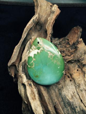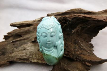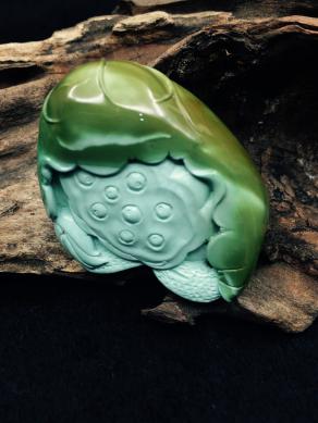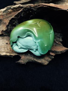 美國羅伊斯頓綠松石把件,表面獨特的褐黃綠色和內(nèi)部的淺藍(lán)色,給了雕刻師豐富的想象,巧妙的俏雕賦予了原材料新的生命,極大提升了綠松石的價值。