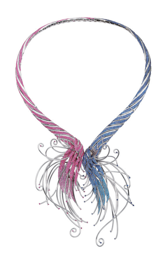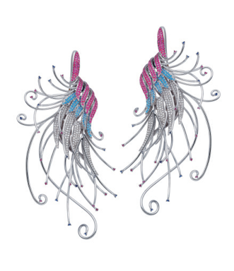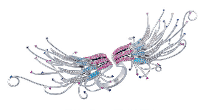 對比這一珠寶首飾造型形式要求首飾設(shè)計(jì)元素間要有明顯的差異性,例如虛與實(shí)、聚與散,大與小、銳利與圓潤等,也可以包括位置與顏色的強(qiáng)烈差異。這些劇烈的變化,給人以鮮明醒目、跌宕起伏的視覺感受,從而加強(qiáng)作品的藝術(shù)表現(xiàn)力。