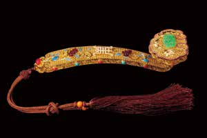 花絲鑲嵌玉石首飾著重表現(xiàn)中國式題材,以花絲為主,鑲嵌為輔。將細(xì)金工藝與螭虎、蟢子、蝙蝠等玉石或?qū)毷馁|(zhì)的吉祥形象結(jié)合,突出金鑲玉的含義,制造出金玉同輝的藝術(shù)效果。用金絲盤繞的雙線圖案、萬壽紋樣和蛛網(wǎng)形狀有著“鎮(zhèn)財(cái)”“福壽”“網(wǎng)喜”的寓意,是細(xì)膩金工與精致玉器的完美結(jié)合。