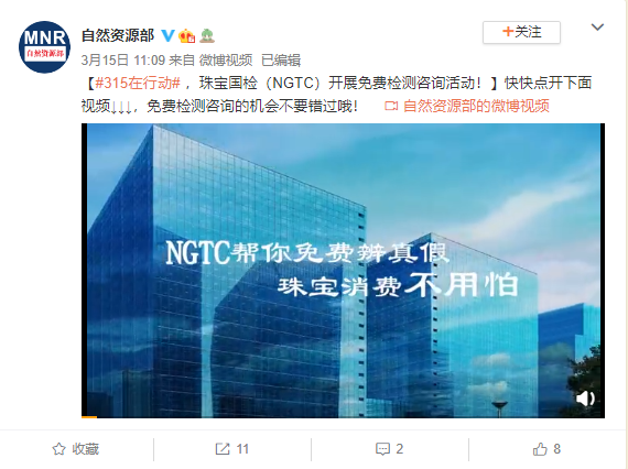 珠寶國(guó)檢(NGTC)助你維權(quán)系列報(bào)道(十一)丨“3.15NGTC在行動(dòng)·助你維權(quán)”視頻短片獲自然資源報(bào)推薦登錄自然資源部官方微博
