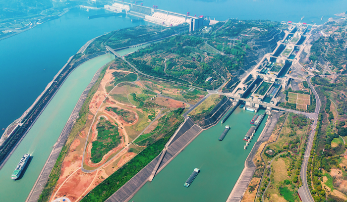 2023年一季度,三峽樞紐航運通過量3989.36萬噸,同比增長22.08%,創(chuàng)投運以來一季度航運通過量最高紀錄。圖為船舶有序通過三峽雙線五級船閘和升船機(2023年4月1日攝) 鄭家裕攝 / 本刊