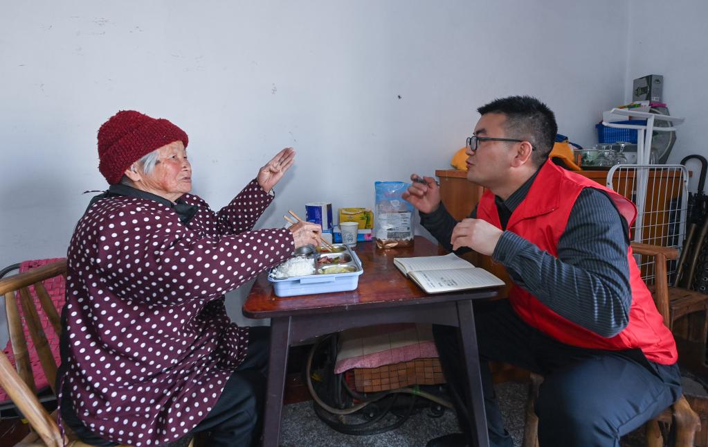 3月28日,在杭州市臨安區(qū)昌化鎮(zhèn)聯(lián)盟村,網(wǎng)格黨員栗雪鋒(右)為90歲的獨居老人帥美珠送餐,并了解她當(dāng)前的困難和需求。新華社記者 徐昱 攝