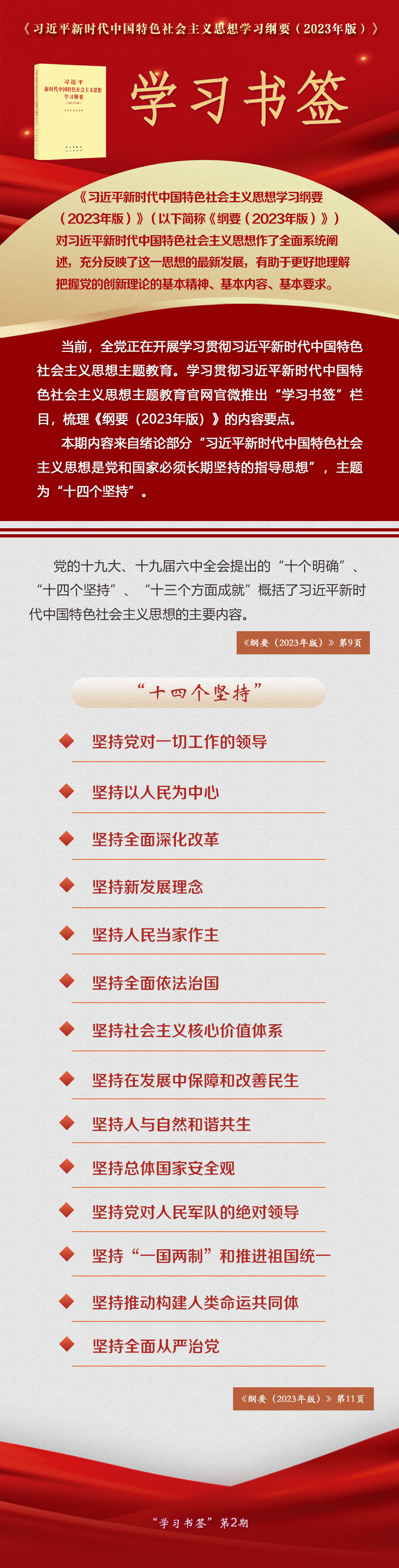 《習(xí)近平新時(shí)代中國(guó)特色社會(huì)主義思想學(xué)習(xí)綱要(2023年版)》 學(xué)習(xí)書(shū)簽丨“十四個(gè)堅(jiān)持”