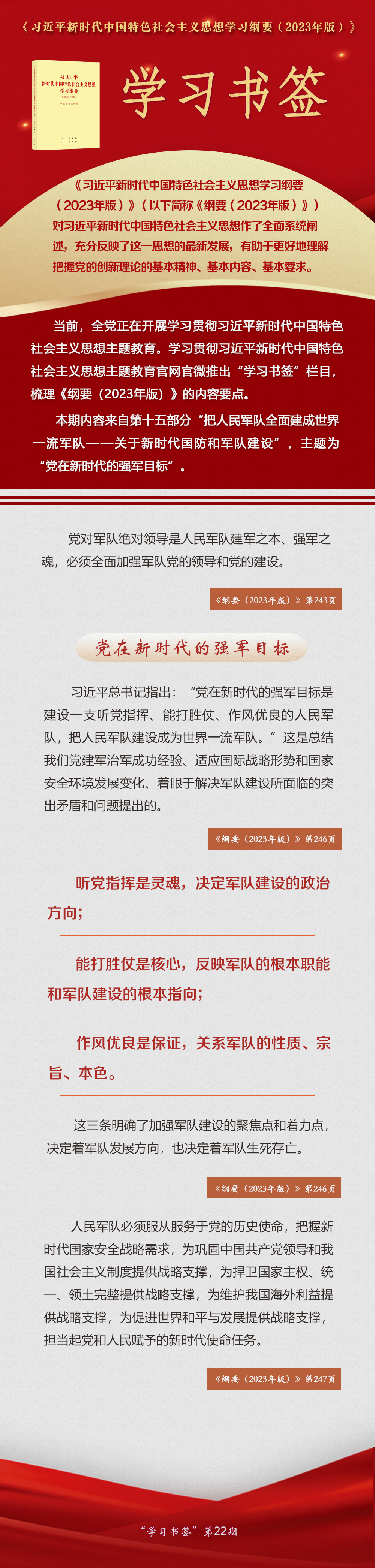 《習(xí)近平新時代中國特色社會主義思想學(xué)習(xí)綱要(2023年版)》 學(xué)習(xí)書簽丨黨在新時代的強(qiáng)軍目標(biāo)