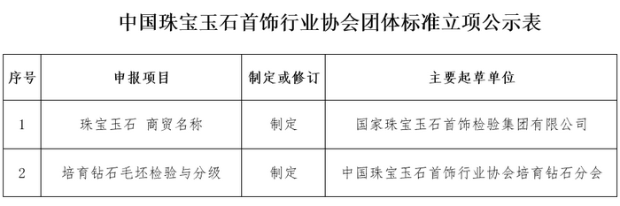 中國珠寶玉石首飾行業(yè)協(xié)會(huì)團(tuán)體標(biāo)準(zhǔn)立項(xiàng)公示