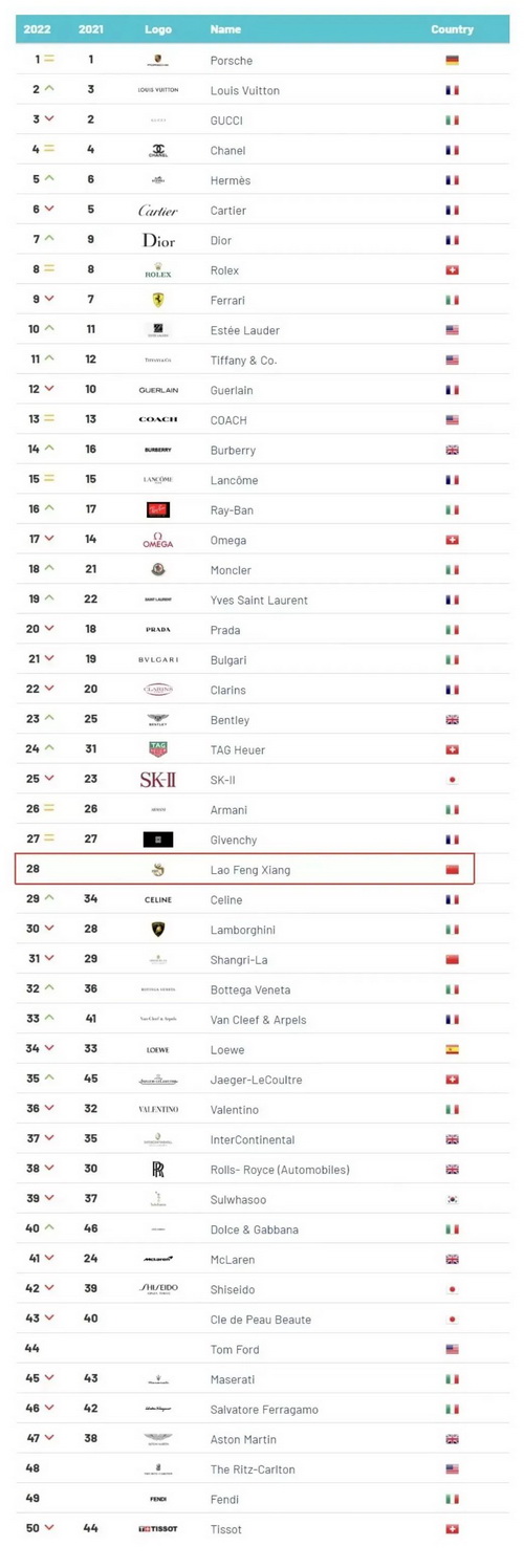 “2022全球高檔和奢侈品牌價值50強”發(fā)布,老鳳祥位列第28位