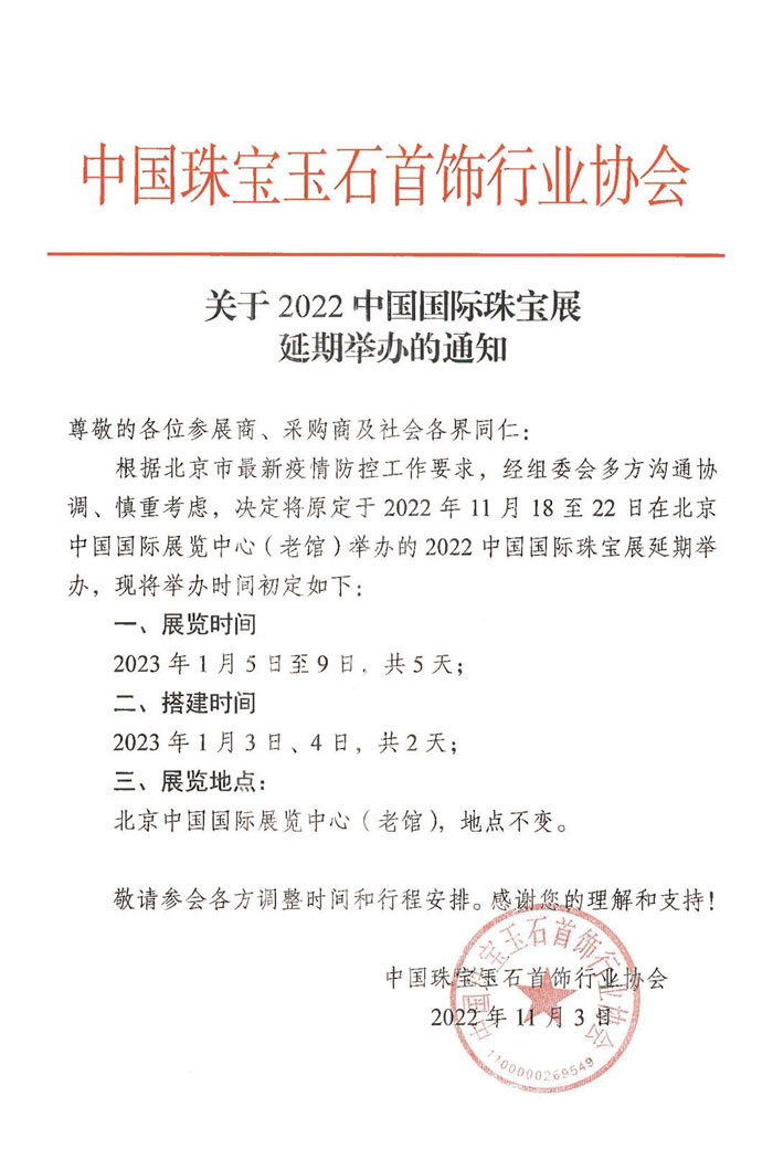關(guān)于2022中國國際珠寶展延期舉辦的通知