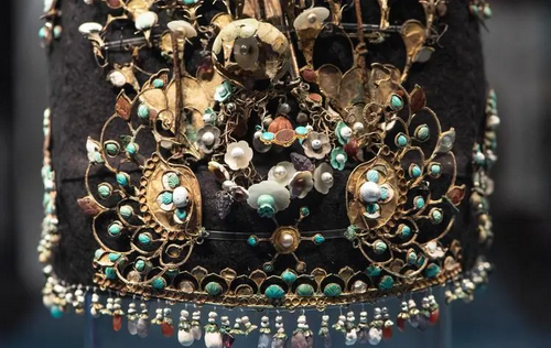 透過(guò)這件冠飾的細(xì)節(jié)可以發(fā)現(xiàn),珍珠均被綠松石、瑪瑙等貴重寶石托了起來(lái),由此可見(jiàn)珍珠在當(dāng)時(shí)受重視的程度。人們發(fā)現(xiàn)珍珠不僅珍貴,還有著非常特殊的光澤,像天空中的星河與夜晚的星光,所以常用珍珠來(lái)形容女性的溫潤(rùn)細(xì)膩、高貴典雅。