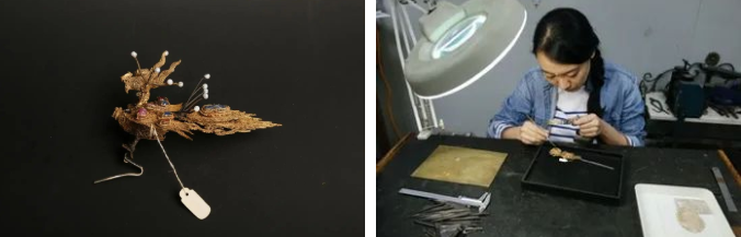 在修復(fù)時(shí),我發(fā)現(xiàn)一件特別神奇的事情,就是冠飾的鳳上都有用彈簧絲頂著的珍珠。當(dāng)把這組冠飾修復(fù)好后擺在那里,只要有人在這個(gè)空間里走動(dòng),彈簧上的珍珠就開(kāi)始不停地顫動(dòng),有著非常強(qiáng)烈、自然的動(dòng)感。