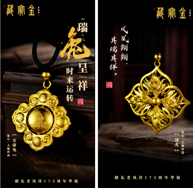 “藏寶金”是老鳳祥貴金屬制品中典藏級高端精品的總稱。老鳳祥“藏寶金”源于古代皇室宮廷文化,經(jīng)過不斷傳承創(chuàng)新,發(fā)展至今。該系列產(chǎn)品是以老鳳祥所獲得的國家級非物質(zhì)文化遺產(chǎn)代表性項(xiàng)目名錄“金銀細(xì)工制作技藝”為基礎(chǔ),并結(jié)合現(xiàn)代新工藝所精心制作的首飾、器皿、掐絲琺瑯制品、手編花絲等系列產(chǎn)品,具有高度的美學(xué)藝術(shù)鑒賞價值和傳承價值。中國工藝美術(shù)大師張心一獻(xiàn)禮老鳳祥175周年華誕的新力作——《安康兔》與《翎秀》,用獨(dú)特的首飾語言展現(xiàn)了中國傳統(tǒng)文化精髓,傳遞美好祝福。
